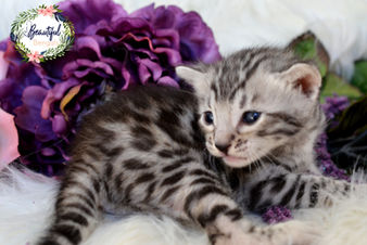 Bengal Type: Purebred Rosetted, Dynamically Marked Silver Snow Bengal. Sterling is ready to bring a touch of exotic luxury and warmth to his new home. His bold ink-black markings will open to a soft Sterling silver center. Sterling's eyes will be a Jewel-toned Emerald Green adding a touch of regal warmth to his icy pearlescent base pelt.